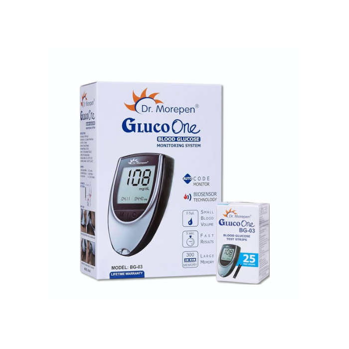 The Dr. Morepen BG-03 Gluco One Glucometer is a smart and easy-to-use blood glucose monitoring system developed for regular diabetes management. It allows users to measure blood sugar levels quickly and accurately, helping them stay informed about their health.Designed for home use, the BG-03 glucometer delivers consistent readings with minimal blood sample requirement. The compact and portable design makes it convenient for daily monitoring, whether at home or while traveling.Trusted by healthcare professionals and widely used across India, Dr. Morepen BG-03 supports safe and informed blood glucose monitoring when used as advised by a doctor.