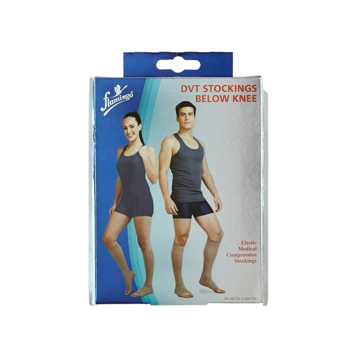 The Flamingo Below Knee Stockings are designed to provide mild support and therapeutic compression for individuals managing varicose veins, post-surgical recovery, pregnancy-related leg discomfort, and mild to moderate leg strains. These stockings help improve blood circulation, reduce edema (swelling), and relieve leg fatigue and pain during daily activities.Made from high-quality 2-way stretch knit fabric, the stockings offer a snug yet comfortable fit that adapts naturally to the shape of the legs. The uniform compression helps support vein health while promoting better blood flow, making them ideal for prolonged standing, sitting, or recovery periods.The open toe and open heel design enhance breathability and comfort, allowing extended wear without irritation. This design also makes the stockings easy to wear and suitable for different foot shapes. Their discreet appearance allows them to be worn comfortably under everyday clothing, making them ideal for regular use at home, work, or while traveling.Flamingo Below Knee Stockings are easy to put on and remove, offering convenience for daily wear. Whether used for medical recovery or preventive care, these stockings provide reliable support, comfort, and improved leg wellness.