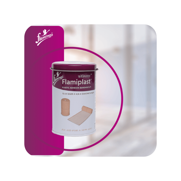Flamingo Flamiplast Elastic Adhesive Bandage (B.P.) is a premium-quality medical bandage specially designed for post-surgery use, injury management, and compression therapy. It delivers effective support and controlled compression to aid recovery while ensuring comfort during prolonged application.The elastic fabric allows the bandage to stretch and conform naturally to body contours, ensuring uniform pressure and stable fixation over joints, muscles, and surgical sites. This helps reduce swelling, support healing tissues, and minimize the risk of re-injury during recovery.Flamiplast features a porous, breathable adhesive that allows airflow to the skin, promoting skin health and reducing moisture buildup. This makes it suitable for extended wear without causing irritation or discomfort. The pressure-sensitive adhesive ensures secure fixation while remaining gentle on the skin.Designed for convenience, the bandage is easily tearable by hand, allowing quick application without scissors. Whether used in hospitals, clinics, or home care settings, Flamingo Flamiplast Elastic Adhesive Bandage is a trusted solution for post-operative compression, dressing fixation, and musculoskeletal support.
