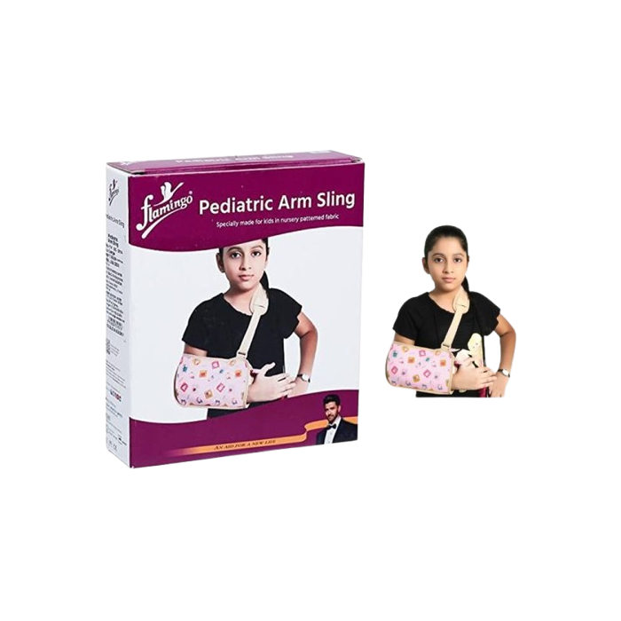 The Flamingo Pediatric Arm Sling is specially designed to provide firm support and immobilization for children recovering from arm fractures, elbow dislocations, or post-casting conditions. It helps maintain the arm in a recommended 90-degree flexion position, which is essential for proper healing and reduced strain on the injured limb.Made from soft, foam-padded fabric, the sling ensures comfort during prolonged wear while offering a secure and supportive fit. The child-friendly nursery prints make the sling visually appealing, helping young patients feel more comfortable and confident during recovery.The adjustable shoulder pad evenly distributes weight across the neck and shoulders, reducing pressure and discomfort. A built-in thumb loop provides additional support and helps minimize thumb fatigue during extended use. Designed exclusively for pediatric needs, the Flamingo Pediatric Arm Sling combines effective immobilization, comfort, and child-friendly design for optimal recovery.