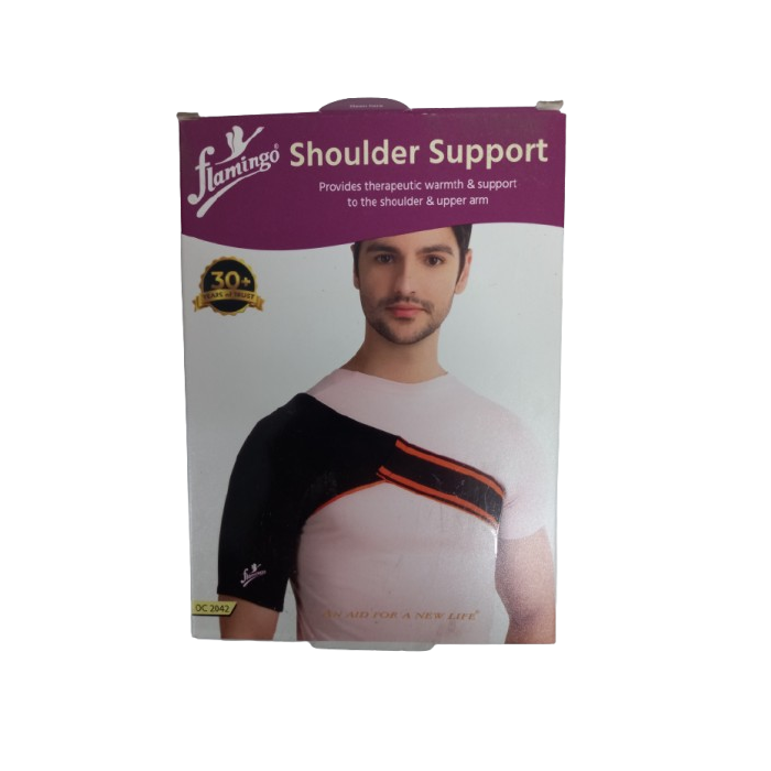 The Flamingo Shoulder Support is designed to provide moderate support and therapeutic relief for individuals suffering from shoulder-related conditions such as rotator cuff tendonitis, post-operative recovery, and shoulder instability. It delivers targeted compression and warmth to the shoulder joint, helping reduce pain, improve circulation, and promote faster healing.Made from soft, breathable knit fabric combined with a wide elastic band, this shoulder support ensures a snug yet comfortable fit for extended wear. The material allows adequate airflow, preventing discomfort and skin irritation during prolonged use. The supportive design helps stabilize the shoulder joint while allowing natural movement, making it suitable for both daily activities and rehabilitation exercises.This shoulder support is versatile and can be worn on either the left or right shoulder, making it convenient for all users. Its discreet design allows it to be worn comfortably under clothing, enabling continuous support throughout the day without affecting appearance or mobility.Ideal for therapeutic use, sports recovery, or post-surgical rehabilitation, the Flamingo Shoulder Support provides consistent support, comfort, and confidence during the healing process.