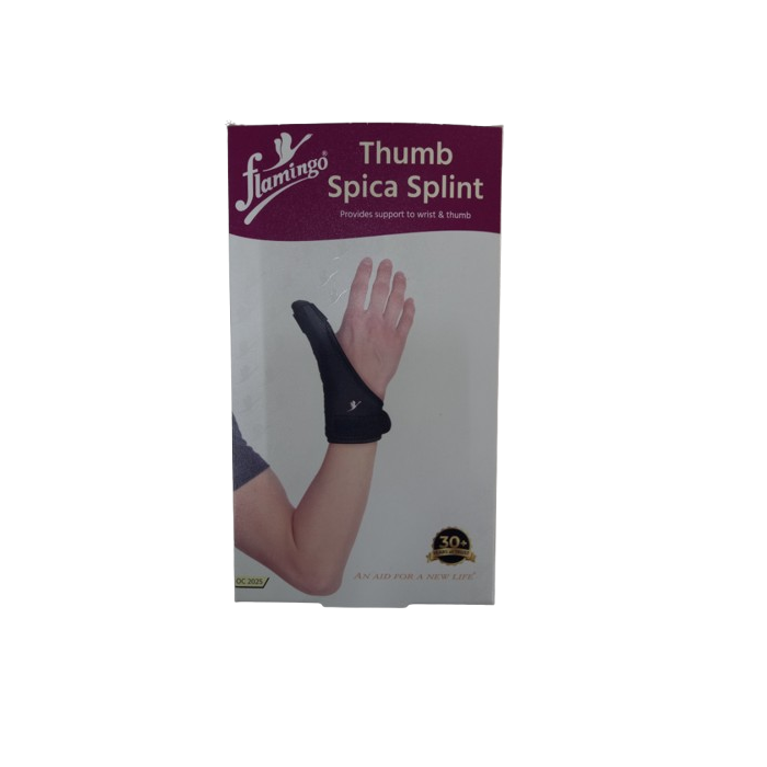 The Flamingo Thumb Spica Splint is designed to provide firm support and effective immobilization for individuals suffering from thumb sprains, ligament injuries, gamekeeper’s thumb, minor thumb fractures, and De Quervain’s disease. It stabilizes the thumb in an optimal abduction position, helping reduce pain, prevent further injury, and promote faster healing.Constructed using soft foam fabric, the splint ensures excellent comfort during prolonged wear while minimizing the risk of skin irritation. The integrated malleable aluminum splint offers strong yet adjustable support, allowing the splint to be shaped according to the user’s thumb anatomy for a secure and customized fit.This thumb splint immobilizes the thumb without restricting finger movement, enabling users to perform daily activities with ease while protecting the injured area. The adjustable hook-and-loop strap system ensures easy application, removal, and controlled compression based on individual comfort needs.Suitable for both left and right hands, the Flamingo Thumb Spica Splint is an ideal choice for injury recovery, repetitive strain protection, and post-injury rehabilitation, delivering reliable stabilization and long-lasting support.