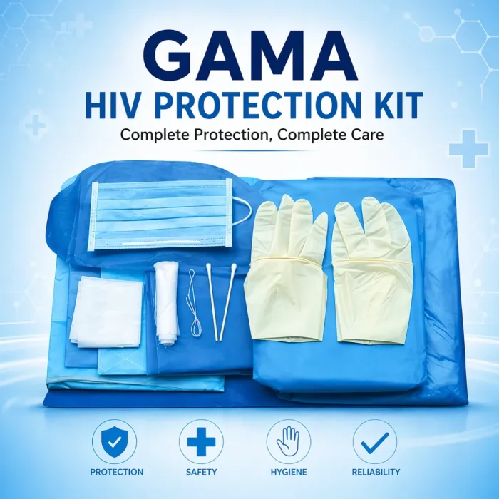 The Gama SafeCare HIV Protection Kit is a comprehensive, single-use medical safety kit designed to ensure maximum protection against infection during handling, examination, or emergency exposure situations. This kit is ideal for hospitals, clinics, laboratories, and healthcare professionals who require reliable protective equipment in high-risk environments. Each kit is carefully assembled using high-quality, sterilized medical-grade materials to provide effective barrier protection and hygiene. The components are skin-friendly, comfortable to wear, and designed for ease of use during extended procedures.